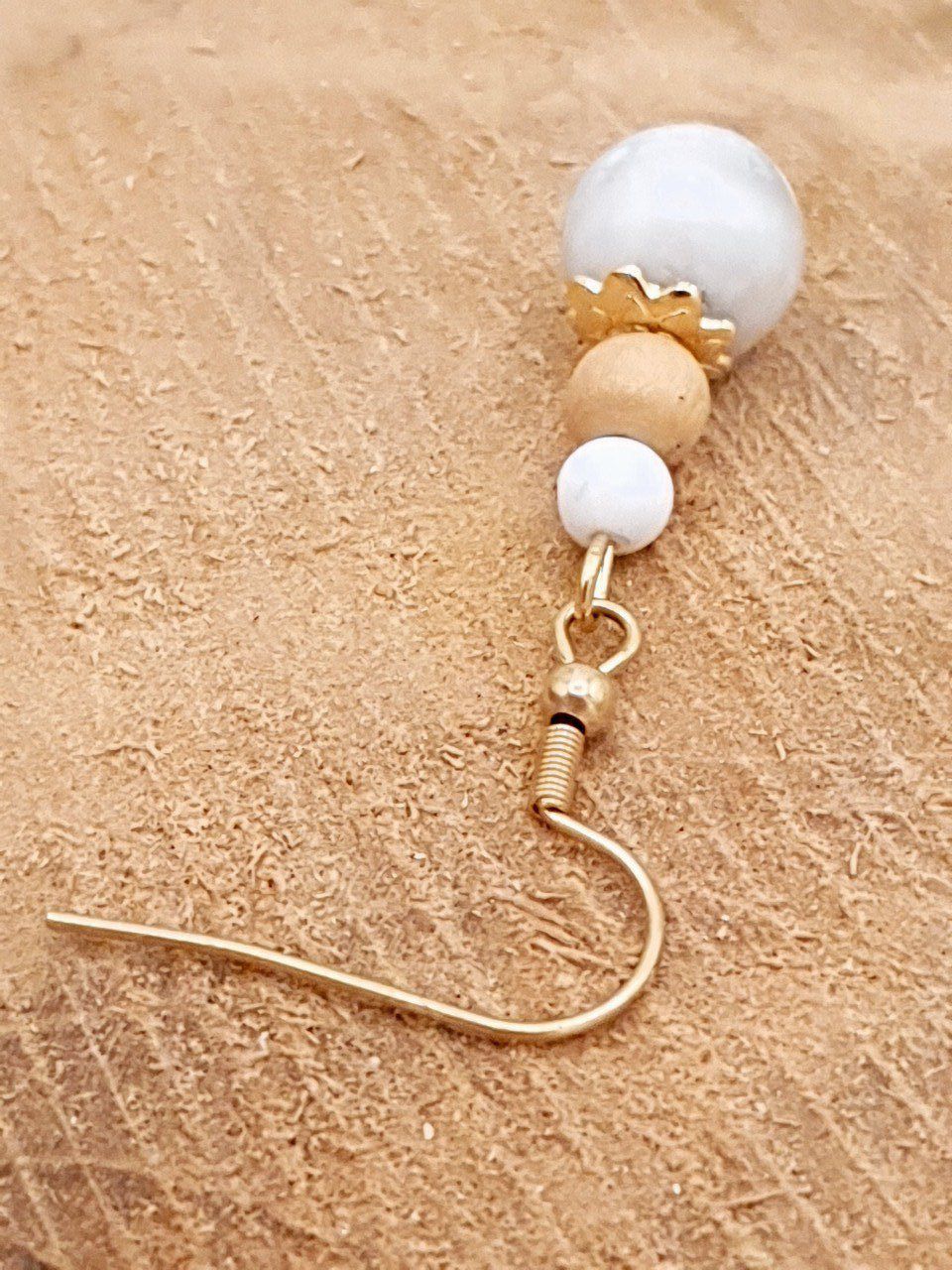 Boucles d'oreilles en howlite blanche ,bois clair et acier doré