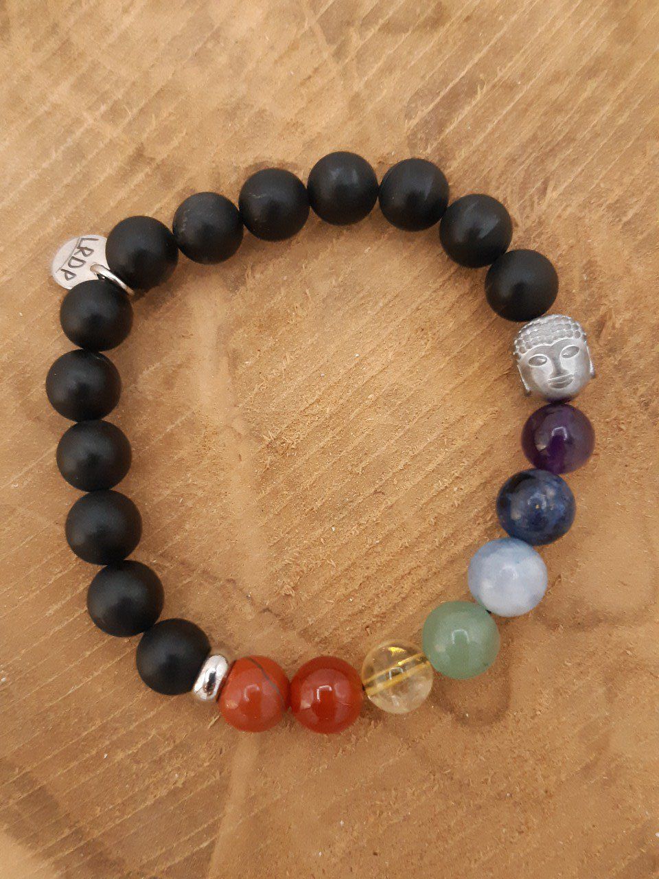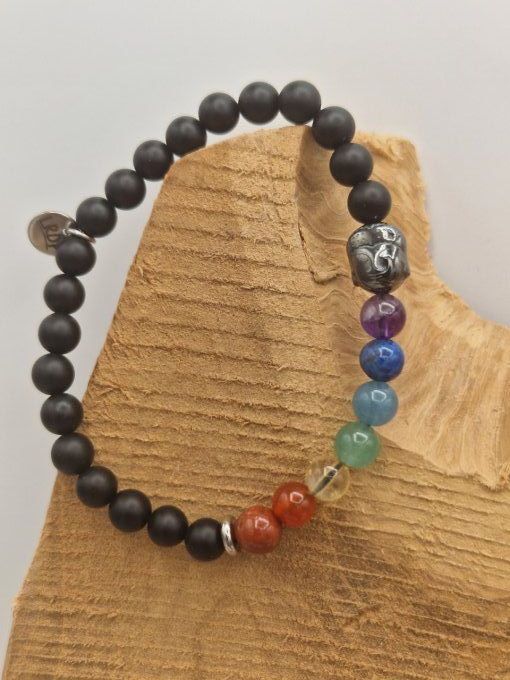 Bracelet des 7 chakras en onyx mat et son bouddha en hématite